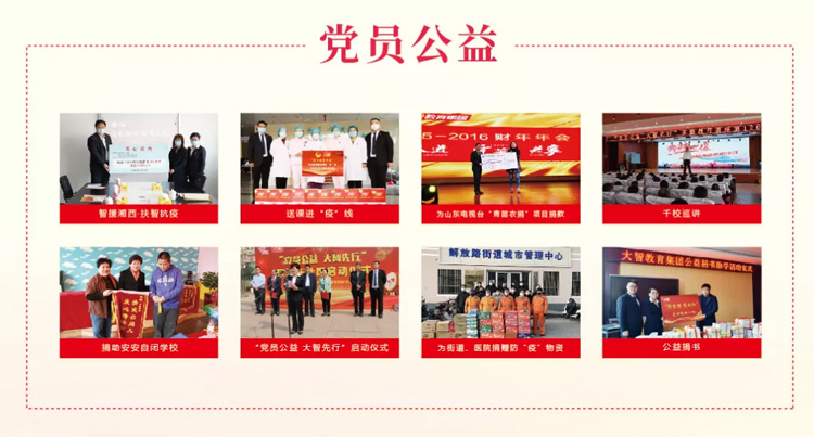多年來,在上級主管部門領導下,大智教育集團積極踐行社會責任,把公益基因植入企業發展之中,啟動了“黨員公益 大智先行”“千校巡講”“大智之星”齊魯學子獎學金評選等公益項目,建立了“智學智愛”志愿服務隊,積極參與到全國文明城市創建、泉城義工、抗疫援助等活動中來,形成了“智惠e”公益品牌。