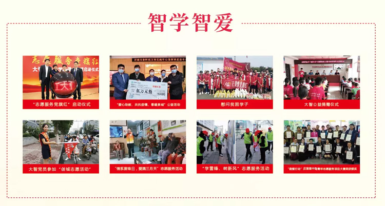 接下來,在黨建引領下,大智將創新開展公益,持續擴大“智惠e”公益品牌的影響力,積極搭建1個公益系統,成立1個志愿服務隊,吸納1千名志愿服務者,服務1百萬學生和家長。