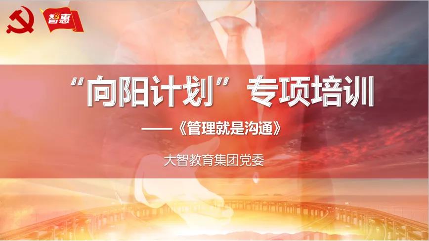 為進一步提高黨員骨干的綜合素質,落實好“三個著力凝團隊”,把業務骨干培養成黨員,把黨員培養成業務骨干,把黨員業務骨干培養成管理人才,為集團干部隊伍輸送新生力量,集團黨委決定從一線選拔了一批思想積極向上、愿意扎根大智平臺的優秀黨員,進行“向陽計劃”專項培訓。