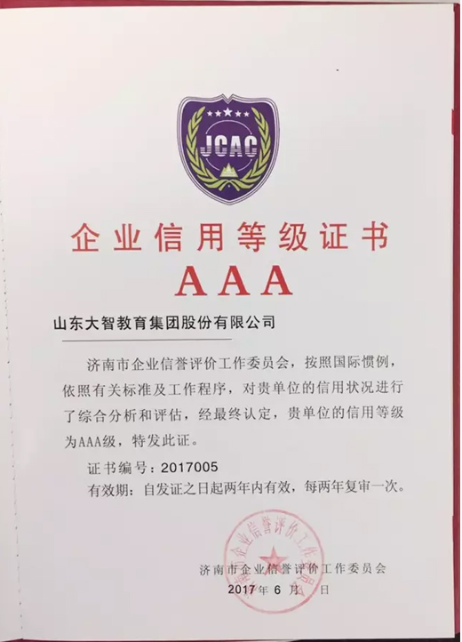 近日,經(jīng)濟(jì)南市企業(yè)信譽(yù)評(píng)價(jià)工作委員會(huì)嚴(yán)格審核與評(píng)估,大智教育集團(tuán)被評(píng)定為企業(yè)信用等級(jí)AAA級(jí),按照企業(yè)信用等級(jí)標(biāo)準(zhǔn),AAA級(jí)為最高信用等級(jí)。