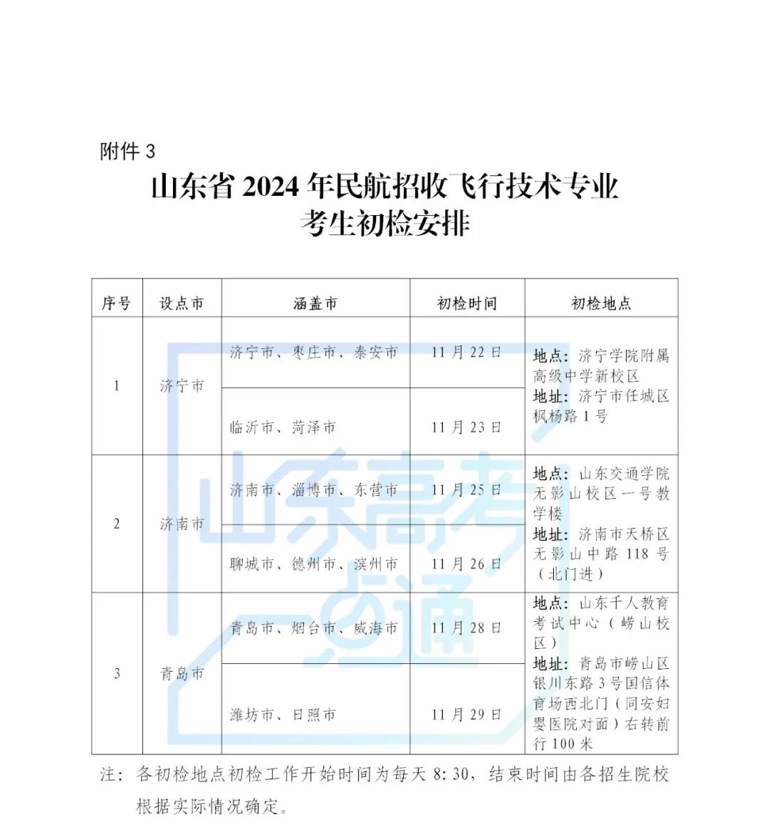 (二)初檢預(yù)選。招飛各項(xiàng)選拔工作由各院校具體組織實(shí)施。我省在濟(jì)南、青島、濟(jì)寧3市設(shè)立招飛初檢站,各招生院校按照規(guī)定時(shí)間在每個(gè)初檢站分別組織初檢預(yù)選工作,具體時(shí)間地點(diǎn)安排見附件3。考生須攜帶身份證及報(bào)考院校規(guī)定的證件材料等,按照附件3規(guī)定的時(shí)間地點(diǎn)到達(dá)指定初檢站,參加擬報(bào)考院校組織的民航飛行技術(shù)專業(yè)的初檢預(yù)選。