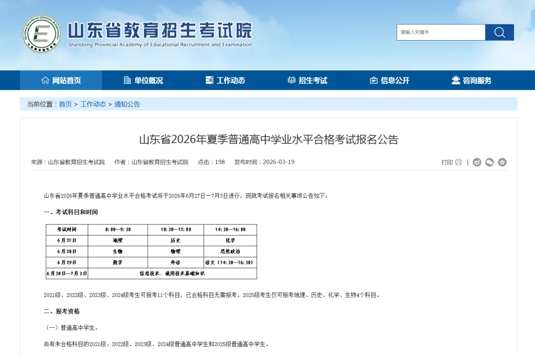 山東省教育招生考試院發布2026年夏季普通高中學業水平合格考試報名公告,報名將于5月8日-17日(每天9:00-17:00)進行,考生千萬不...
