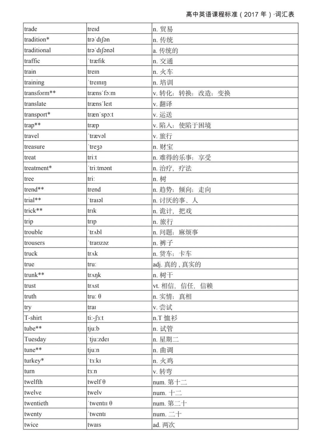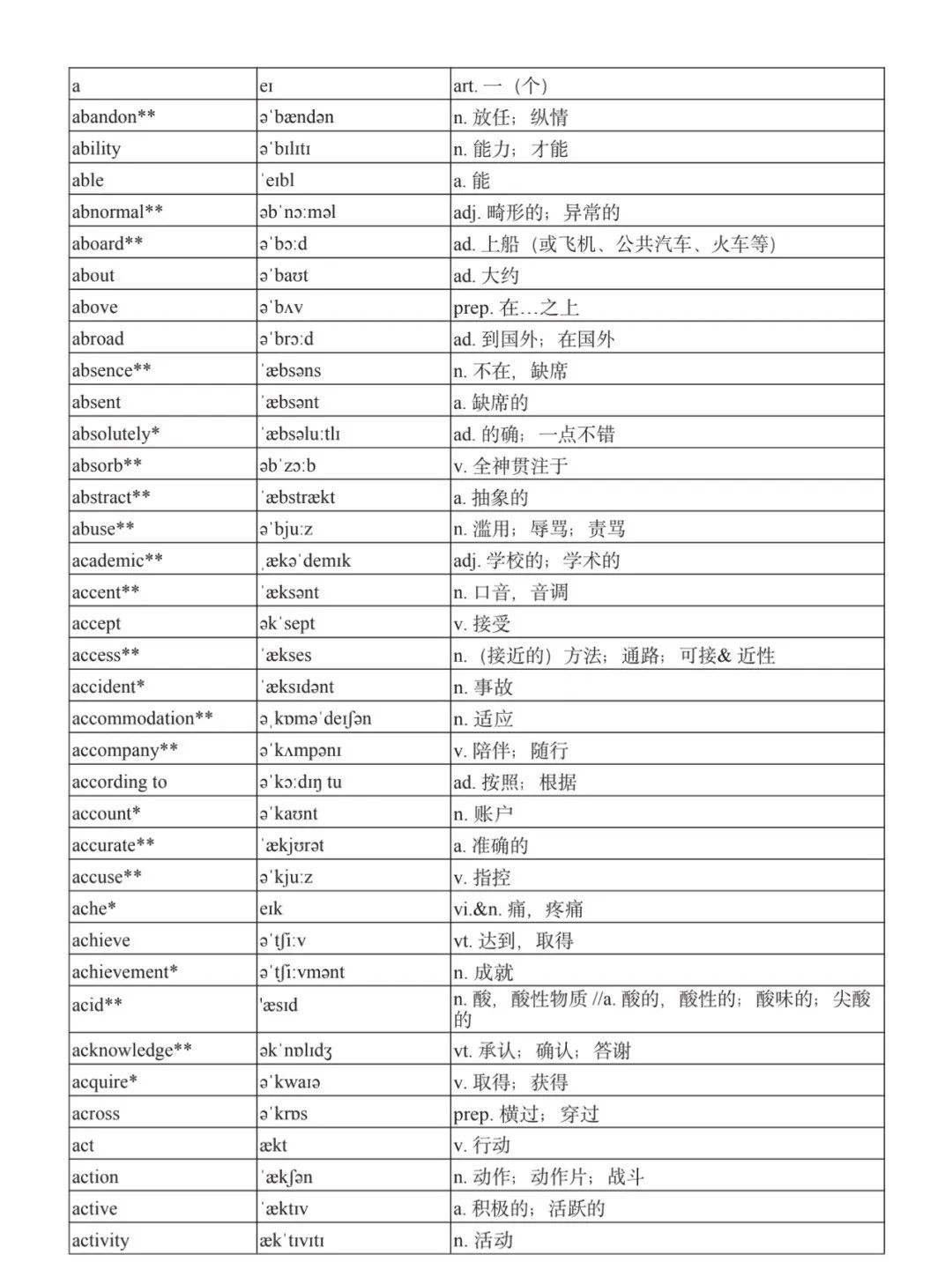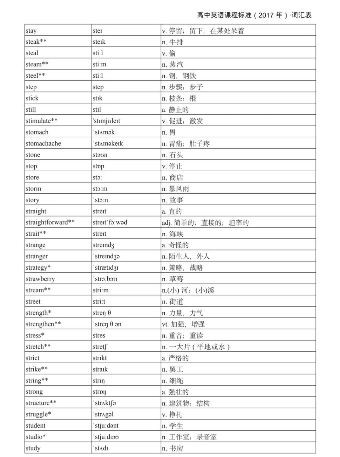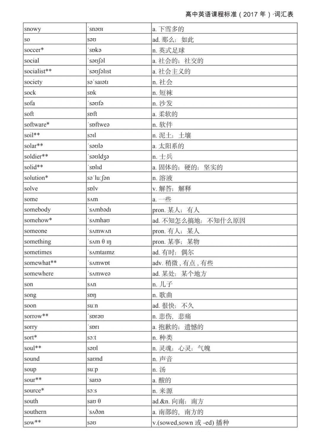 本詞匯表共收 3000 個(gè)單詞,含義務(wù)教育階段要求掌握的 1500 個(gè)單詞。高中英語必修課程應(yīng)學(xué)習(xí)和掌握 500 個(gè)單詞(表中加有一個(gè) * 號(hào)),累計(jì)達(dá) 2000。選擇性必修課程應(yīng)學(xué)習(xí)和掌握 1000 個(gè)單詞(表中加有兩個(gè) *號(hào)),累計(jì)達(dá) 3000。各地可根據(jù)實(shí)際情況在本詞匯表所收詞的基礎(chǔ)上,再選擇增加 200 個(gè)單詞。