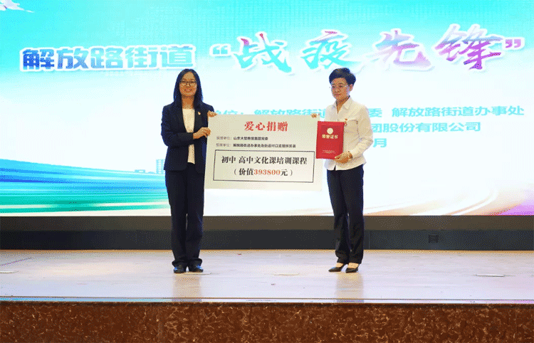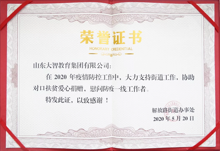 戰疫不忘扶貧,活動現場,大智向解放路街道辦事處及街道對口支援扶貧縣城捐贈價值393800元公益課程,街道辦事處現場為大智頒發榮譽證書,對大智表示感謝。