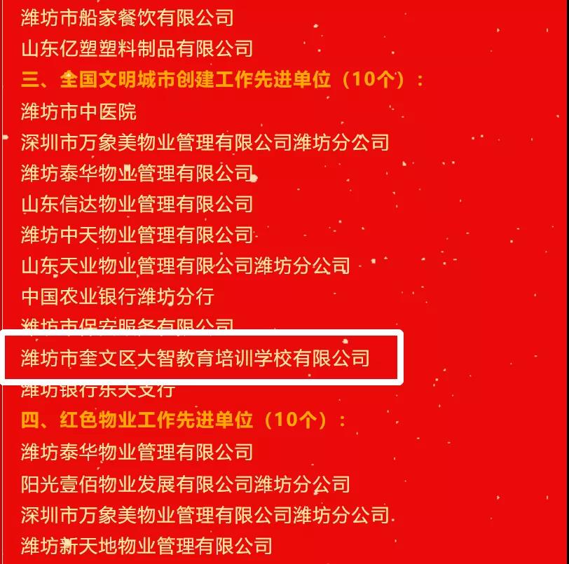 自濰坊市文明城市創(chuàng)建以來,大智濰坊區(qū)域拼搏實干,奮勇爭先,做文明創(chuàng)城的宣傳者、踐行者,落實疫情防控工作,深化精神文明創(chuàng)建,積極踐行社會責任,營造了向上向善、文明安全的良好氛圍。近日,大智濰坊區(qū)域榮獲“2020年度全國文明城市創(chuàng)建工作先進單位”稱號。