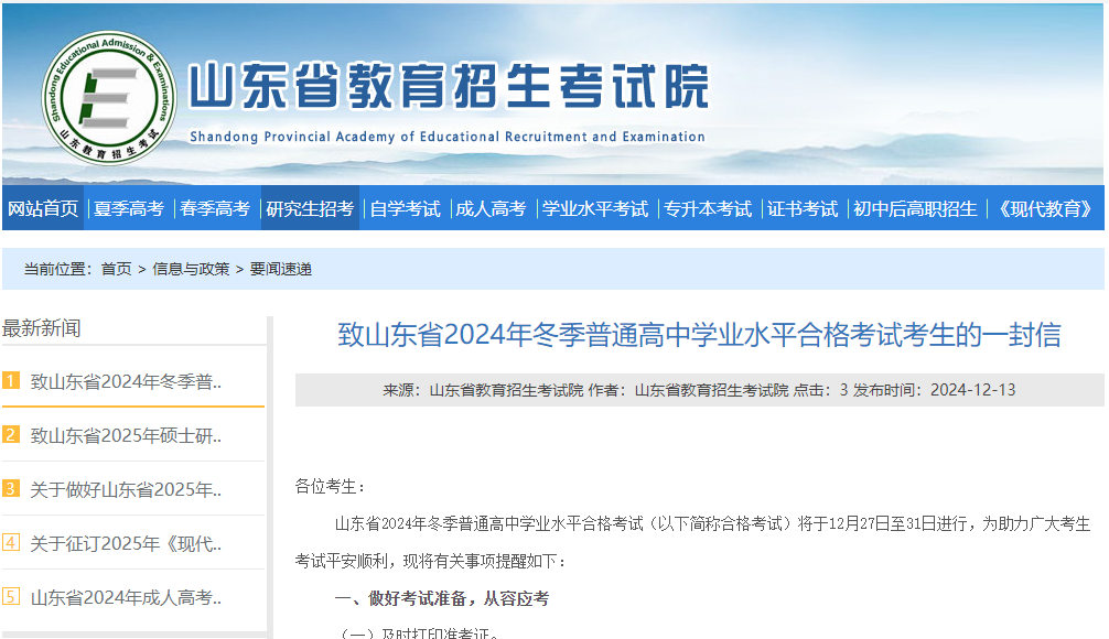 山東省教育招生考試院發(fā)布《致山東省2024年冬季普通高中學(xué)業(yè)水平合格考試考生的一封信》提醒各位考生,請考生在規(guī)定時(shí)間登錄報(bào)名系統(tǒng)自行打印準(zhǔn)考證,打印時(shí)間為:12月20日—12月25日每天9:00—17:00,12月26日—12月31日每天7:00—20:00。