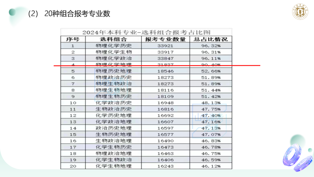 通過分析這個數據,我們看到,物化加組合可報考的專業條數都在 90% 以上,下圖中紅線以上的部分里,我們可以看到相關結果。
