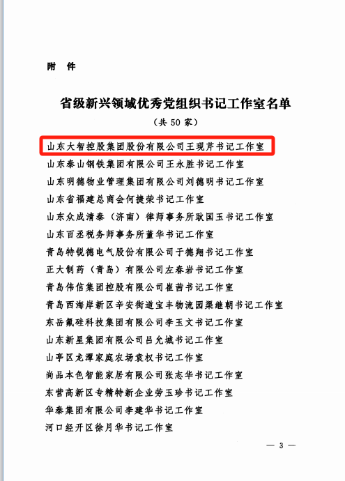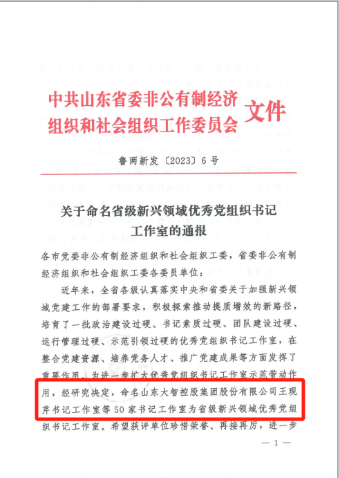 為充分發揮新興領域優秀黨組織書記工作室示范帶動作用,近日,中共山東省委非公有制經濟組織和社會組織工作委員會發布《關于命名省級新興領域優秀黨組織書記工作室的通報》,授予山東大智控股集團股份有限公司王現芹書記工作室等50家書記工作室為省級新興領域優秀黨組織書記工作室。