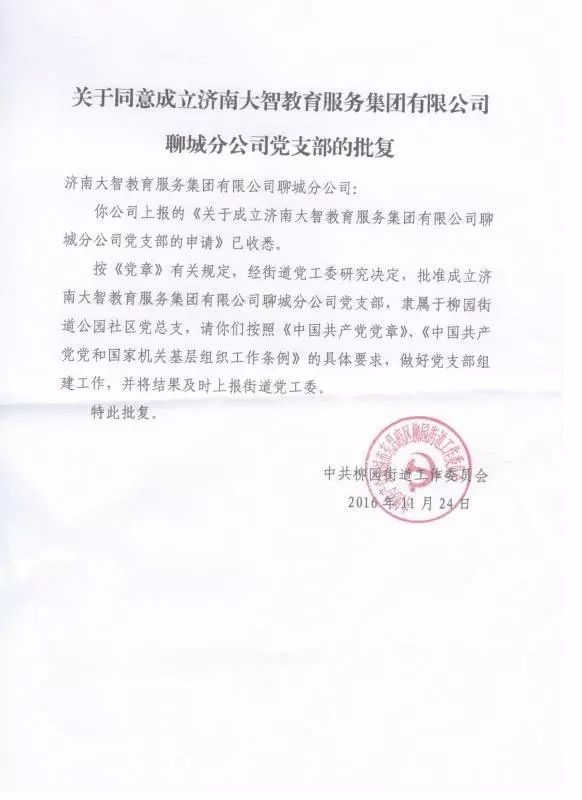 中共濟南大智控股集團有限公司聊城分公司支部委員會獲批復
