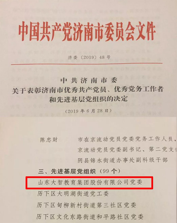 此次被評為“濟南市先進基層黨組織”將激勵大智控股集團黨委再接再厲,不斷提升黨建工作質量和水平,努力在引領改革發展,推動做大做強中當先鋒、做表率,為濟南市建設“大強美富通”現代化國際大都市作出積極貢獻。