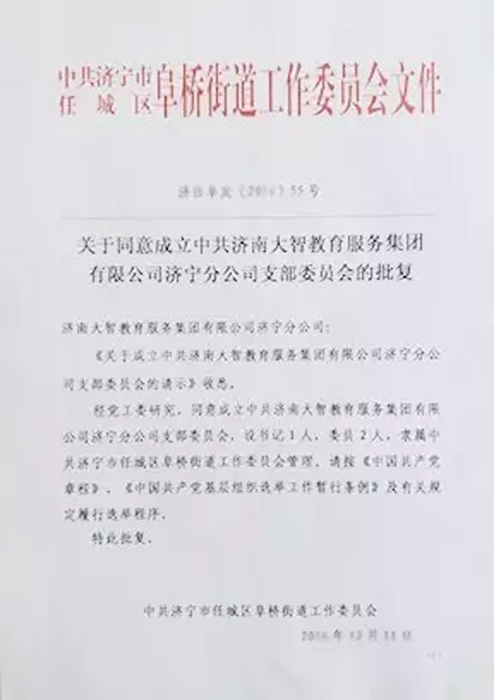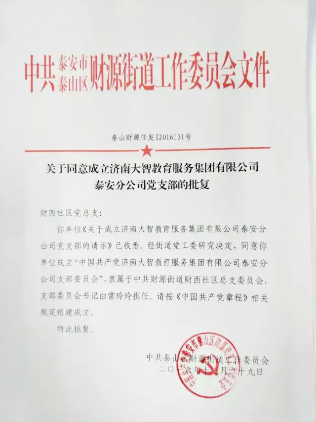 2016年10月10日,中共張店區馬尚鎮委員會正式批復同意成立中共濟南大智教育服務集團有限公司淄博分公司支部委員會。這是大智教育集團繼臨沂分...