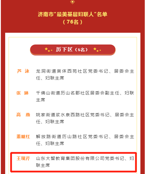近日,濟南市婦聯(lián)公布了最美基層婦聯(lián)人名單,大智教育集團黨委書記、婦聯(lián)主席王現(xiàn)芹被評為濟南市最美基層婦聯(lián)人。 在王現(xiàn)芹書